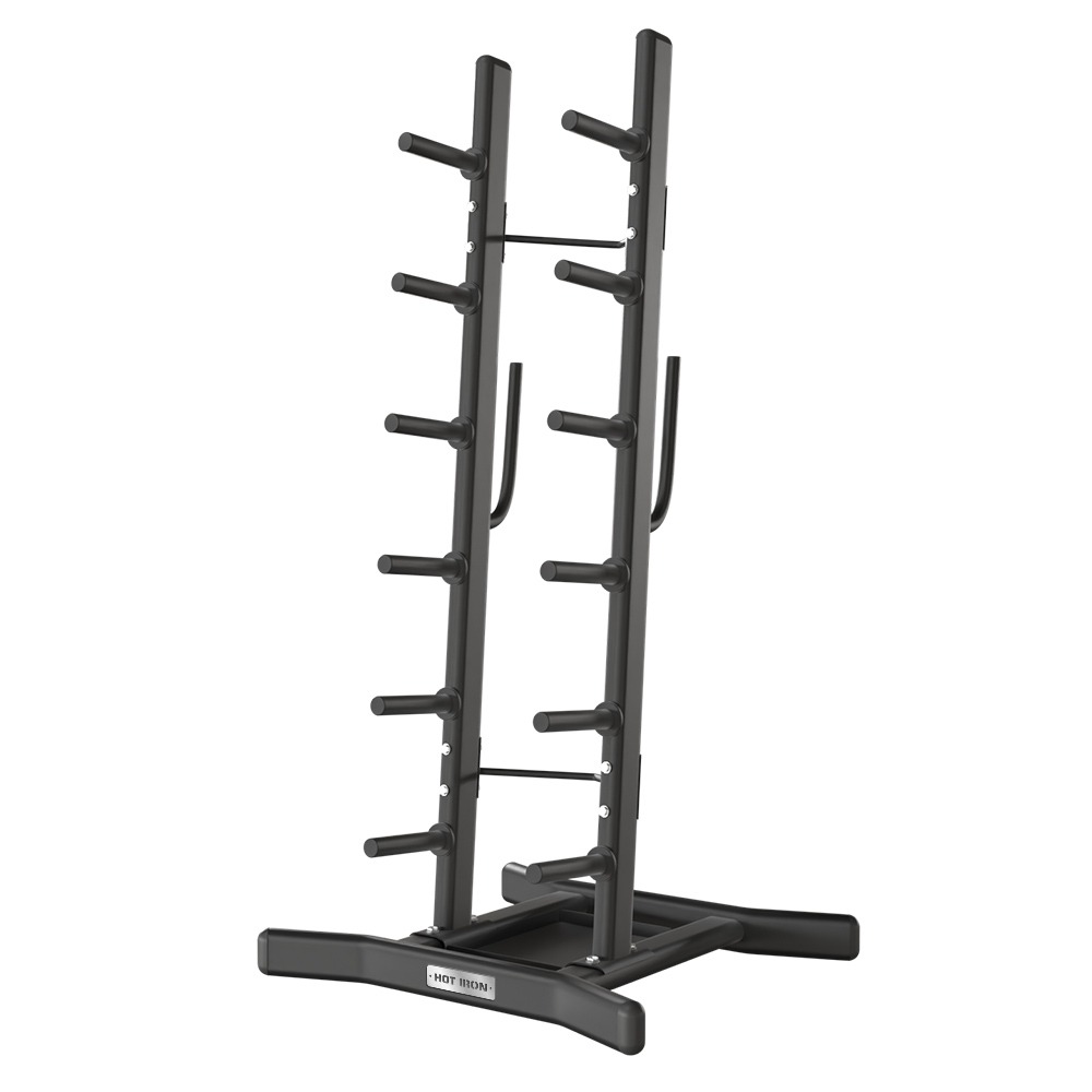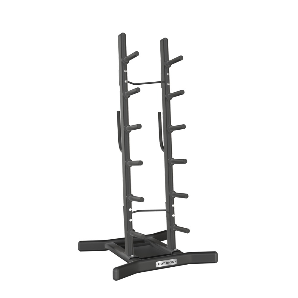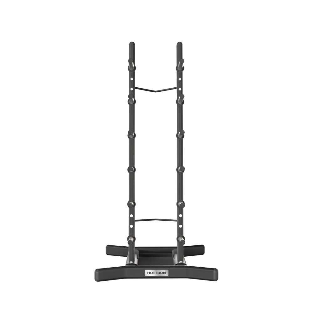 Стеллаж HOT IRON из стали 8 мм для хранения 10 штанговых комплектов. Чёрное порошковое покрытие, металлический логотип HOT IRON.